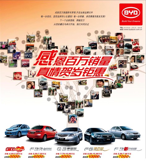比亞迪汽車(chē)僅用了7年時(shí)間就突破100萬(wàn)輛銷(xiāo)量,創(chuàng)造了中國(guó)汽車(chē)業(yè)的奇跡。感恩于消費(fèi)者的支持與厚愛(ài),比亞迪特舉辦了“感恩百萬(wàn)銷(xiāo)量 真情賀歲鉅惠”活動(dòng),活動(dòng)時(shí)間為2010年12月10日——2011年1月20日(距離活動(dòng)結(jié)束可是越來(lái)越近了)。