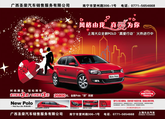 第九屆的 “廣西南寧婚慶文化博覽會(huì)”將于3月4日到3月6日在廣西會(huì)展中心盛大開(kāi)幕。上海大眾廣西圣榮將于展會(huì)期間推出新POLO特惠活動(dòng)。期間訂購(gòu)上海大眾新POLO車(chē)系除了獲得特惠價(jià)格外,還可以抽取各項(xiàng)大獎(jiǎng)。獎(jiǎng)品設(shè)有彩電、冰箱、婚紗攝影等,期待您的領(lǐng)取。