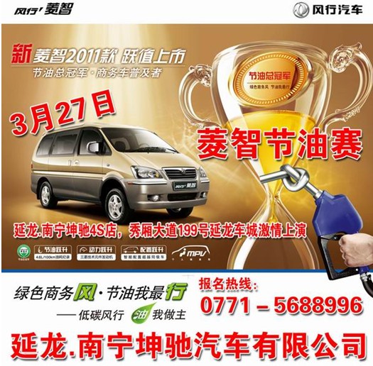 風(fēng)行汽車廣西旗艦店南寧坤馳4S店為祝賀菱智2011款上市,同時也為了讓客戶進一步體驗到菱智優(yōu)秀的節(jié)油性能,特在3月27日舉行菱智節(jié)油賽。