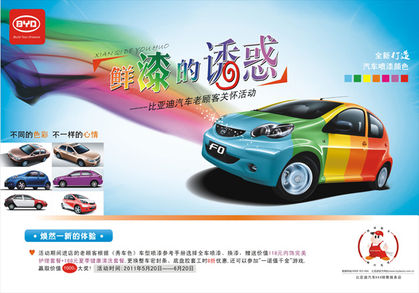 翔遠(yuǎn)宏盛服務(wù)店為了回饋老顧客一直以來(lái)對(duì)我店的支持和厚愛(ài),特開(kāi)展“鮮漆的誘惑”比亞迪汽車?yán)项櫩完P(guān)愛(ài)活動(dòng)。5月20日—6月20日,凡回家的老顧客均可享受全車噴漆、換漆大優(yōu)惠,不同的顏色,不一樣的心情;更換整車密封條、底盤膠套工時(shí)8折優(yōu)惠;屆時(shí)還可以參加游戲贏取千元驚喜!