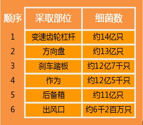 韓國(guó)KBS播出的一個(gè)《逃脫危機(jī)NO.1》節(jié)目里,對(duì)車輛內(nèi)部的細(xì)菌刑警實(shí)驗(yàn)。采取車輛內(nèi)部各部分的細(xì)菌,對(duì)它們進(jìn)行16小時(shí)的配置,把細(xì)菌檢測(cè)結(jié)果到處,結(jié)果如下: