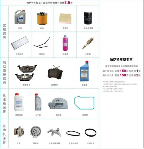 夏季活動期間,帕薩特用戶購買表中所列任意原裝零件,可享受以下優(yōu)惠