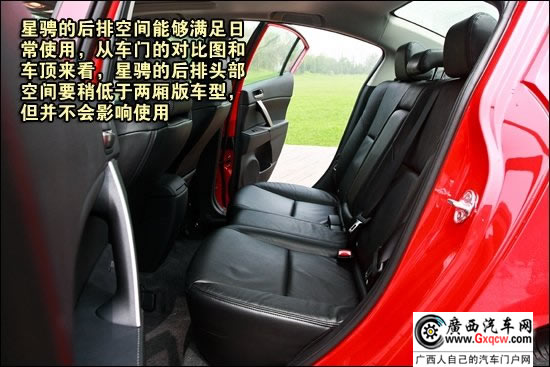 星騁雖然要比兩廂版車型長出90mm,但在乘坐空間上看,星騁卻并沒有多少優(yōu)勢。相同的軸距尺寸,相同的寬大舒適且富有支持性的座椅在兩款車上均有配置。不過從后車門和車頂來看,兩廂版車型在后排乘客頭部空間上還占有一定優(yōu)勢。至于后排中央扶手、ISOFIX兒童安全座椅安裝位都能在星騁上找到。