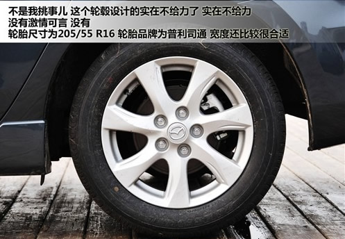 首先對與馬自達3星騁外觀上的進化表示肯定,確實更為硬朗了,但是看到輪轂不禁表示下不滿,這個輪轂設計的太中性了,沒有任何的激情可言,樣式過于中庸。輪胎使用普利司通品牌,尺寸為205/55 R16