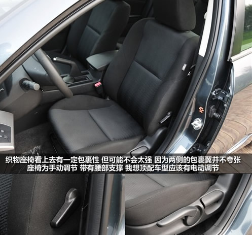 座椅為織物材質(zhì),看上去有一定的包裹性,但是沒我們想象的那么強,因為我們發(fā)現(xiàn)座椅兩側(cè)的包裹并不那么飽滿。座椅為全手動調(diào)節(jié),帶有腰部支撐。頂配車型應(yīng)該為真皮并且為電動調(diào)節(jié)。