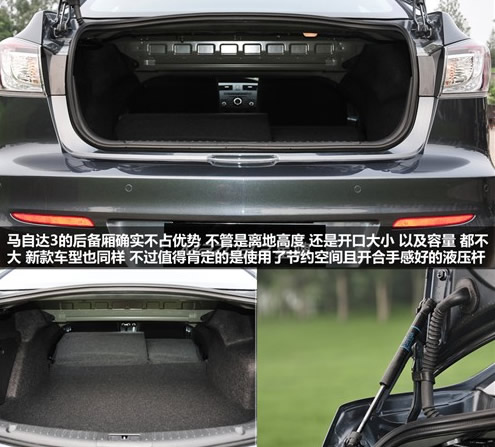 從外觀我們就不難看出,馬自達3的車尾比較短小,所以它的后備廂不占有優(yōu)勢,不管是離地高度還是開口大小,以及后備廂內(nèi)部空間,都不是很大,多連桿后懸掛占據(jù)了不少空間,星騁也同樣如此,不過可以肯定的是后備廂蓋的支撐使用了節(jié)約空間且開合手感好的液壓桿。
