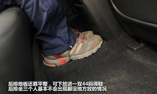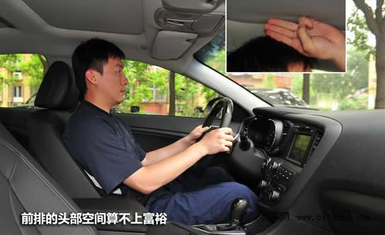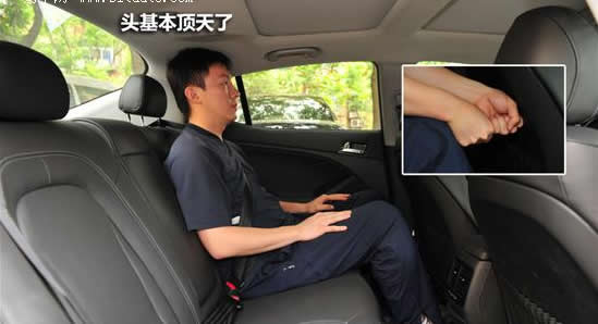 后排的腿部空間沒(méi)得說(shuō),身高181cm的編輯腿部腿部至少還有兩拳的余量,個(gè)矮點(diǎn)兒的人甚至還能翹個(gè)二郎腿。另外起亞后排的中間位置很寬敞,44碼得鞋可以輕松的放在里面,這樣就算后排坐三個(gè)人,至少放腳的地方絕對(duì)夠用。但和前排空間一樣,后排空間的問(wèn)題也出在頭頂上,坐直之后編輯的頭基本上已經(jīng)頂?shù)杰図斄,?dāng)然真正坐車的時(shí)候,也沒(méi)幾個(gè)人像圖中編輯那樣坐的筆直,所以總的來(lái)說(shuō)K5的乘坐空間還是可以接受的。