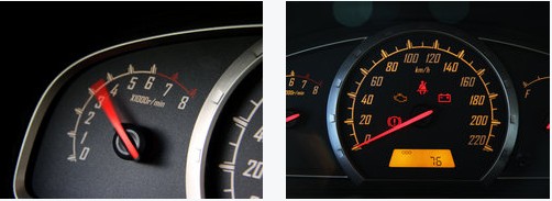寶駿630采用了傳統(tǒng)的指針式儀表盤,設(shè)計風(fēng)格非常簡潔明確,而且采用橘色背景光。整個組合式儀表盤采用了三模塊設(shè)計,從左到右依次是引擎轉(zhuǎn)數(shù)表、時速表還有油表;蛟S是要照顧“對稱設(shè)計”的目的,筆者很難理解把儀表盤的如此大的空間用來單一顯示剩余燃油量的目的。不過紅色的指針確實(shí)很有警示作用。