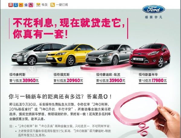 *上述信貸項目嘉年華適用型為1.5L系列、“2年0利率”項目蒙迪歐-致勝適用車型為2.3L系列。