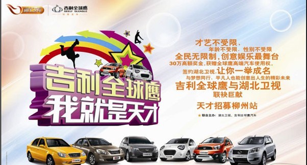 一舉成名,簽約湖北衛(wèi)視,獲得吉利全球鷹高端汽車,不再是夢(mèng)想,9月5日,湖北衛(wèi)視大型勵(lì)志綜藝節(jié)目—《吉利全球鷹我就是天才》率先在武漢賽區(qū)正式啟動(dòng)。才藝不受限,只要你有出眾的才藝,只要你能在比賽中勝出,一切皆有可能,與夢(mèng)想同行,平凡人也能創(chuàng)意出人生精彩未來。