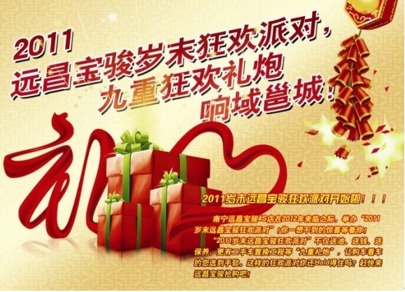 即日起至2011年12月31日歲末,參與“遠(yuǎn)昌寶駿歲末狂歡派對”活動,就可輕松首付12600元,把您的愛駒“貸”回家。不僅如此您還可以選擇輕松貸款“零”利息等“購車狂歡派對”多種活動•••