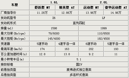 首先我們來看看馬自達3星騁兩廂幾個車型在售價方面的差別,這款新車共分4款車型,分別為1.6L和2.0L兩種排量,分為了舒適型、精英型、運動型和豪華運動型。由于在外觀、內(nèi)飾、舒適豪華配置以及動力方面存在著差異,這6款車型最高差價為3.7萬元。
