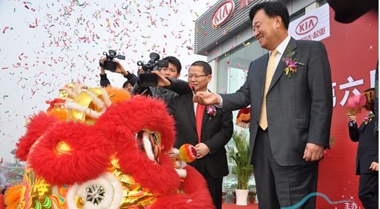 東風(fēng)悅達(dá)起亞汽車有限公司總經(jīng)理蘇南永先生與東風(fēng)悅達(dá)起亞鹽城悅達(dá)東方專營(yíng)店董事長(zhǎng)崔林先生為舞獅點(diǎn)睛