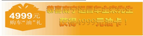 上汽通用五菱2011年10月21日至2011年12月31日的“唯您專享禮遇VIP”活動(dòng)在4999元油卡誕生后圓滿結(jié)束。恭喜南寧遠(yuǎn)昌車主宋先生成為此次4999元油卡的幸運(yùn)得主之一。具體中獎(jiǎng)詳情請(qǐng)上寶駿官網(wǎng)查詢或者咨詢當(dāng)?shù)亟?jīng)銷商。