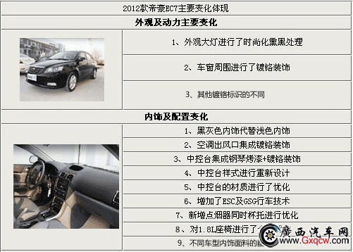 2012款EC7相對于經(jīng)典款車型,進(jìn)行了多達(dá)30余項(xiàng)的進(jìn)化,最大的亮點(diǎn)就是新增了匹配自主研發(fā)動力的1.5L車型,于此同時(shí),外觀和內(nèi)飾進(jìn)行了相應(yīng)運(yùn)動時(shí)尚化的改進(jìn),增加了包括電子穩(wěn)定系統(tǒng)及起停系統(tǒng)等高科技人性化配置。