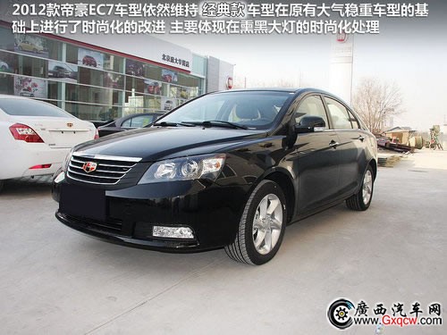 帝豪EC7雖然已經(jīng)上市兩年有余,自上市以來,憑借著大氣穩(wěn)重的車身外形、精致的做工及卓越的性價(jià)比而熱賣。2012款車型依然維持經(jīng)典款車型原有大氣穩(wěn)重車型的基礎(chǔ)上進(jìn)行了時(shí)尚化的改進(jìn),主要體現(xiàn)在熏黑大燈的時(shí)尚化處理。