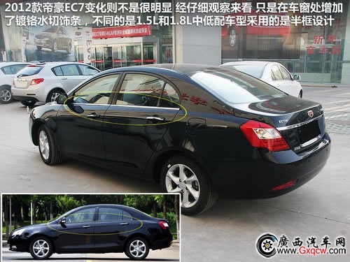 對于車身側(cè)面,2012款帝豪EC7變化則不是很明顯,經(jīng)仔細(xì)觀察來看,只是在車窗處增加了鍍鉻水切飾條,不同的是1.5L和1.8L中低配車型采用的是半框設(shè)計(jì),而1.8L最高配車型則采用了全框樣式設(shè)計(jì)車型,這也是間接區(qū)分部分車型配置的明顯之處,值得一提的是,帝豪EC7全系車型配備了折疊遙控鑰匙。