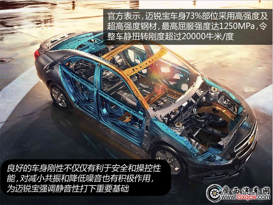 “邁銳寶采用BFI一體化車身架構(gòu),車身73%部位采用高強度及超高強度鋼材,最高屈服強度達1250MPa,令整車靜扭轉(zhuǎn)剛度超過20000牛米/度”,這是官方宣傳稿上的一段話,對于它的車身剛性雖然我無法考究真實性,想必大家不用過多懷疑,來自相同平臺的君威的操控性已經(jīng)廣受好評了,邁銳寶自然也不會差到哪里,盡管它并不像君威那樣標榜運動。