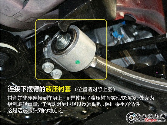 懸掛下擺臂的液壓枕套絕對是邁銳寶的特色,首先是鋁制的外殼減少了重量,最重要的是通過襯套內(nèi)部液壓的緩沖作用而避免硬碰硬連接,盡可能的減少傳遞給車內(nèi)的震動。工程師表示,擺臂運動時的阻尼也是經(jīng)過精心調(diào)校的,剛開始設(shè)計時阻尼偏小,對震動的傳遞過于敏感,適當增大阻尼后很好的解決了這個問題。減震器彈簧兩端采用了材料不同的緩沖材料,目的只有一個,就是過濾震動增強舒適性。