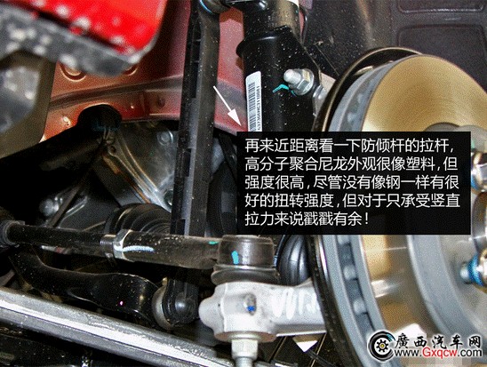邁銳寶做了很多輕量化的工作,鋁合金擺臂就是其中之一,同時,防側(cè)傾支桿也采用高分子聚合尼龍,它很輕摸起來像塑料但事實上強度很高,承受防側(cè)傾桿支桿這樣的縱向力是綽綽有余了。