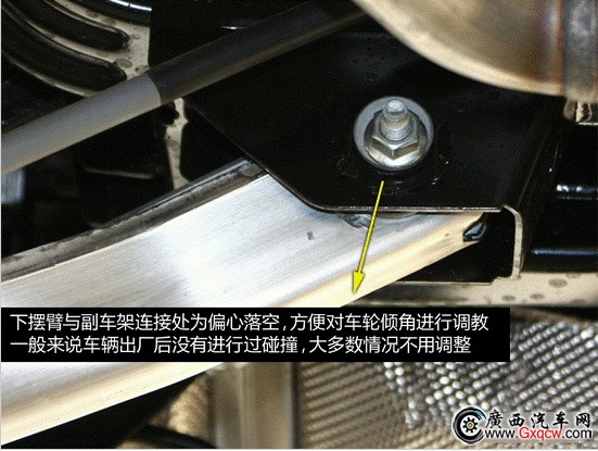 在下擺臂與副車架的結(jié)合處使用了一個偏心螺母,方便對車輪的外傾角做出調(diào)整,工程師表示,一般車輛在不發(fā)生碰撞的情況下基本無需做四輪定位。