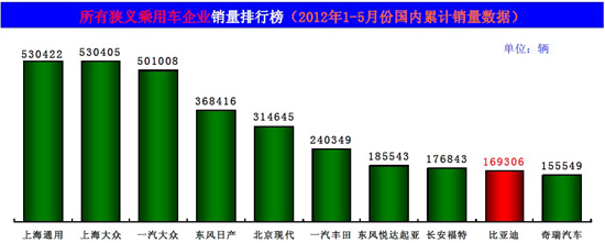 2012年1-5月份比亞迪國內(nèi)累計銷量為169306輛,喜獲2012年1-5月份自主狹義乘用車企業(yè)國內(nèi)累計銷量冠軍,位列全部狹義