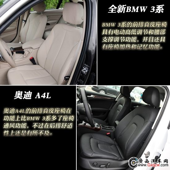 在座椅配置方面,BMW 3系的前排真皮座椅具有電動高低調(diào)節(jié)和腰部支撐調(diào)節(jié)功能,并且還具有座椅加熱和記憶功能,在乘坐舒適性上做到了極致,而它的后排座椅舒適性上也很突出,加上空間的優(yōu)勢,可以說領(lǐng)先同級車型。而奧迪A4L的前排真皮座椅在功能上比BMW 3系多了座椅通風(fēng)功能,不過在后排舒適性上還是有所不及。