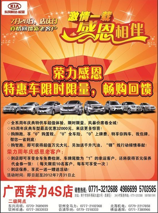 廣西榮力汽車銷售服務有限公司有著完善的售后服務體系,將以最快的速度、最佳的服務滿足用戶需求,向東風悅達起亞汽車消費者奉獻安全環(huán)保、超越期望的汽車產(chǎn)品以及完善的售后服務,為消費者創(chuàng)造更美好、更便捷的汽車生活。