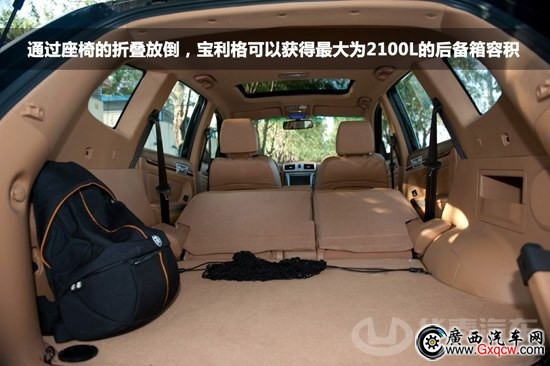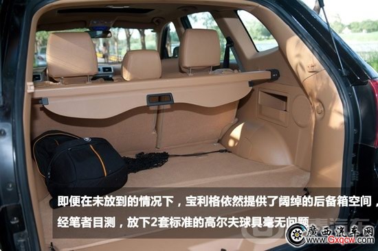 寬敞的后備箱空間自然是SUV車型的法寶。通過座椅的折疊放倒,寶利格可以獲得最大為2100L的后備箱容積。其實即便在未放到的情況下,寶利格依然提供了闊綽的后備箱空間,經(jīng)筆者目測,放下2套標(biāo)準(zhǔn)的高爾夫球具毫無壓力。