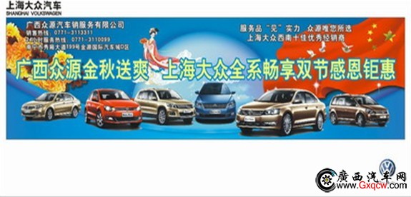 21-25日“2012華南城東盟汽車展銷會(huì)”期間,廣西眾源金秋送爽,上海大眾全系暢享雙節(jié)感恩鉅惠。相約“2012華南城東盟汽車展銷會(huì)”C4展位,或蒞臨秀廂大道廣西眾源展廳,一同暢享車展年度鉅惠,訂購(gòu)全新朗逸還有神秘時(shí)尚禮品贈(zèng)送喔。