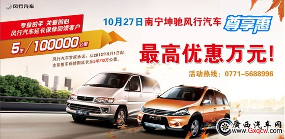 為了慶祝風(fēng)行景逸上市5周年,同時祝賀風(fēng)行景逸今年連續(xù)8月榮獲銷量冠軍,南寧坤馳風(fēng)行汽車團(tuán)購尊享會即將全面啟動,10月27日將在店內(nèi)舉辦“專業(yè)的手關(guān)愛的心"--風(fēng)行汽車周年慶尊享惠活動,風(fēng)行景逸1.5、景逸1.6SUV、菱智M5、菱智1.6全系均有活動及好禮。
