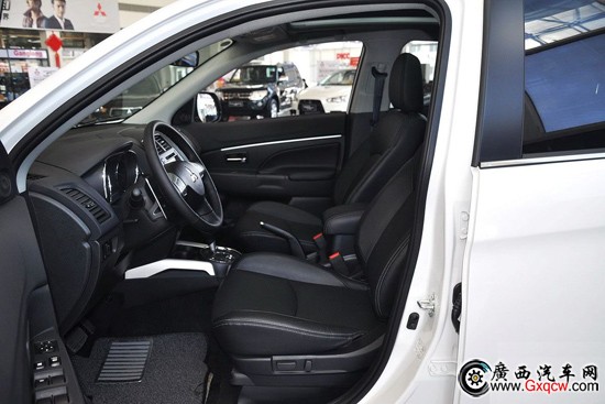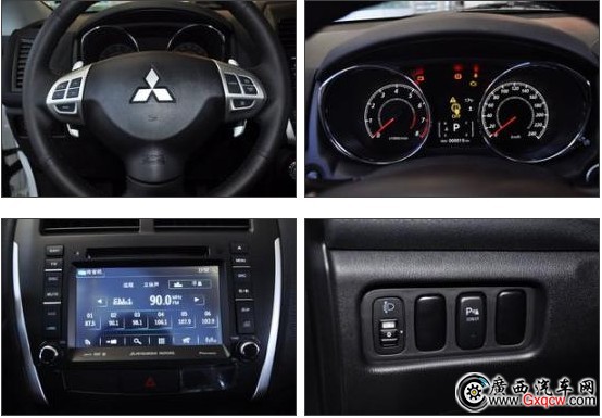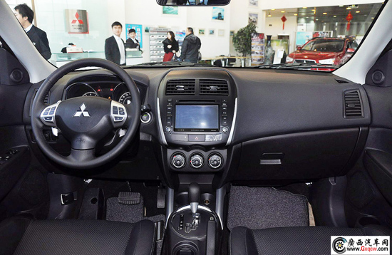 ASX勁炫的內(nèi)飾采用了全黑的設(shè)計,銀色的裝飾增加了運動感,黑底白字雙炮筒儀表簡單明了,卻不失為個性。儀表中間的彩色液晶顯示屏分辨率不錯,畫質(zhì)很細膩,很多常用的功能如水溫、油量等也都被放在這里顯示,看上去要比那種單色液晶舒服很多。