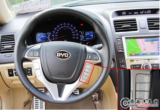 比亞迪G6的多功能儀表盤大大提升了內(nèi)飾科技感,該儀表盤具有22級的背光調(diào)節(jié)功能,儀表盤兩側(cè)分別擁有4.3寸液晶屏,可顯示多種行車信息,非常實(shí)用。多功能一體機(jī)支持的功能也非常強(qiáng)大,在擁有導(dǎo)航、DVD、電視接收、SD卡讀取、USBAUX接口讀取、藍(lán)牙手機(jī)連接功能的基礎(chǔ)上,還可對雙區(qū)自動空調(diào)進(jìn)行控制,非常直觀方便。