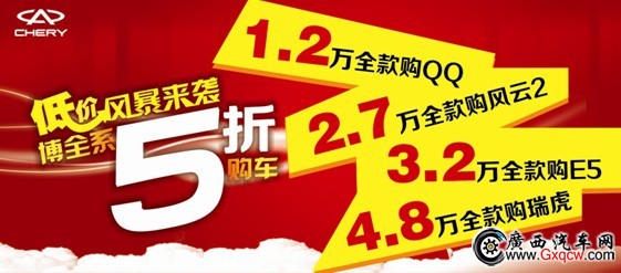 奇瑞汽車廣西鑫廣達(dá)旗艦店為感謝廣大車主多年來對(duì)本企業(yè)的支持,正值店慶之際,感恩大回饋,傾情啟動(dòng)“旗瑞低價(jià)風(fēng)暴來襲 博全系五折購車”大型返現(xiàn)抽獎(jiǎng)活動(dòng),凡2012年11月1日-24日在廣西區(qū)奇瑞汽車廣西鑫廣達(dá)店面購買任意一款奇瑞汽車,均可享受不同程度的鉅惠,還有機(jī)會(huì)享11月25大型返現(xiàn)抽獎(jiǎng)活動(dòng):五折全款購車返現(xiàn)、八折全款購車返現(xiàn)、冰箱、液晶彩電、微波爐、掛燙機(jī)、豆?jié){機(jī)、床上四件套、珊瑚絨毯、U盤等豐厚抽獎(jiǎng)大禮。這么大的優(yōu)惠您還在等什么?心動(dòng)不如行動(dòng),趕快參與活動(dòng)吧!