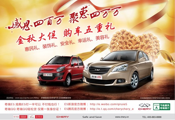 在9月1日-11月30日“金秋大促”期間,凡購買奇瑞QQ等車型,可享受極其優(yōu)惠的五重好禮,包含惠民禮、裝飾禮、安全禮、幸運禮、愛心禮;這五重好禮為消費帶來看得見、摸得著的實惠。