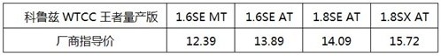 雪佛蘭科魯茲WTCC王者量產(chǎn)版價格(單位:萬元)