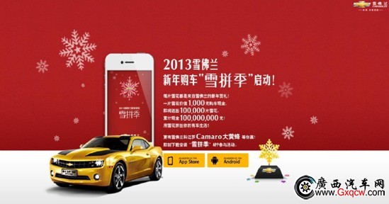 在這次兇猛來襲的“雪拼季”中,你可以從蘋果APP store或安卓 store上搜索“雪拼季”,下載并安裝該游戲,在游戲中抓到的每片雪花價值1000元購車現(xiàn)金,單臺車最多可以抵扣10片雪花,也就是高達1萬元!此外同時集齊6款不同顏色雪花,就有機會贏取“大黃蜂”科邁羅跑車一年使用權(quán)!更有8臺iPhone 5送出!如果你自認為是幸運兒,還不趕緊下載來玩?
