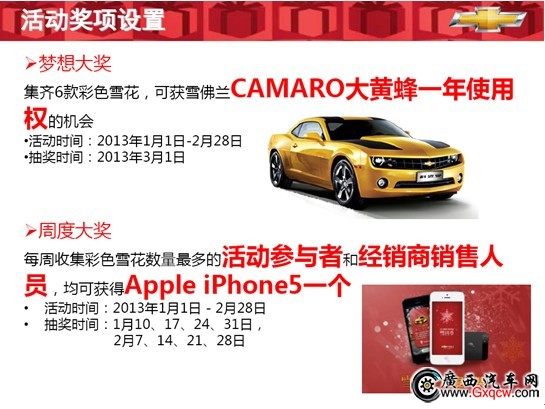 什么是“雪拼季”?“雪佛蘭新年購車雪拼季”是雪佛蘭品牌在2013年推出的新年購車優(yōu)惠活動,它以智能手機終端APP游戲“雪拼季”為載體,通過玩游戲應(yīng)用來贏得購車優(yōu)惠和參與大獎;顒有问叫路f,獎品豐富,并融合了時下年輕人的諸多生活熱點:APP、iPhone5、年底shopping(血拼)和Dream Car,開創(chuàng)了汽車行業(yè)娛樂化促銷之先河。