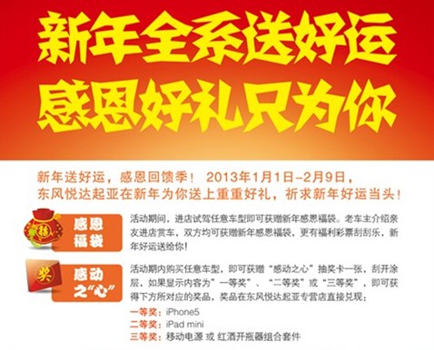 新年好運(yùn),感恩回饋季!2013年1月1日—2月9日期間,東風(fēng)悅達(dá)起亞為您送上重重豪禮,祈求新年好運(yùn)當(dāng)頭!