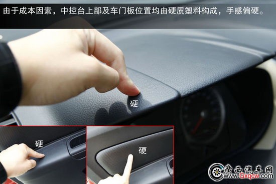 內(nèi)飾方面與老款車型相同,整體布局和做工方面均與日產(chǎn)騏達(dá)處于同一水平。只是由于成本因素,中控臺上部及車門板位置均由硬質(zhì)塑料構(gòu)成,手感偏硬。不過板材接縫很均勻,同時盡管這臺試駕車是新車,但車內(nèi)異味較小,可以看出作為合資自主的R50這在方面很有優(yōu)勢。