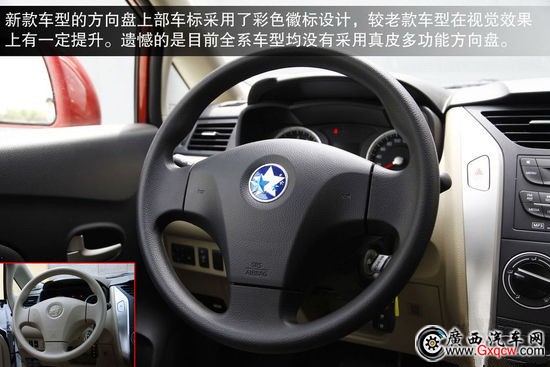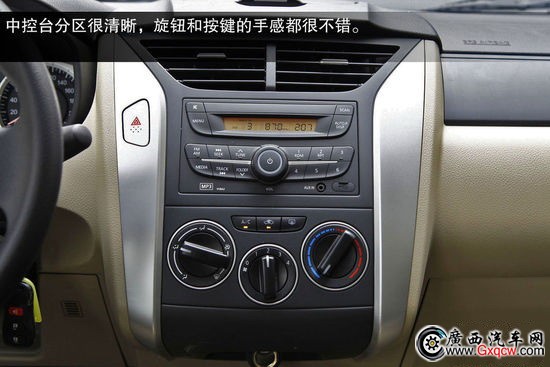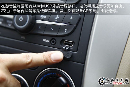 新款車型的方向盤車標(biāo)采用了彩色徽標(biāo)設(shè)計,較老款車型在視覺效果上有一定提升。遺憾的是目前全系車型均沒有采用真皮多功能方向盤便利性有待提升。中控臺分區(qū)很清晰,旋鈕和按鍵的手感都很不錯。在影音控制區(qū)配有AUX和USB外接音源接口,這使得播放音樂更加自由,不過由于這臺試駕車是低配車型,其并沒有配備CD系統(tǒng),比較遺憾。
