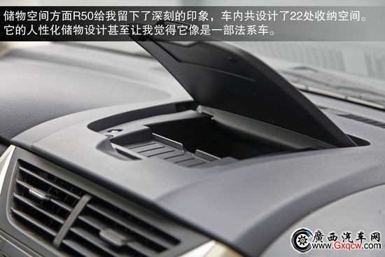 值得肯定的是在車內(nèi)的儲物空間方面,R50給我留下了深刻的印象,儲物盒或儲物槽非常豐富,這甚至讓我覺得它是一部法系車,人性化儲物空間非常充裕。車內(nèi)共設(shè)計了22處收納空間滿足隨時隨地的儲物需求。