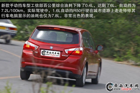經(jīng)過多方面的升級,新款手動擋車型工信部百公里綜合油耗下降了0.4L,達(dá)到了6L、自動擋為7.2L/100km。實(shí)際駕駛中,1.6L自動擋R50行駛在城市道路上走走停停其行車電腦顯示的油耗也僅為7.8L,非常出色的表現(xiàn)。