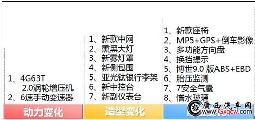 配置方面,新款車型新增MP5+GPS+倒車影像、新款座椅、真皮多功能方向盤(定速巡航+藍(lán)牙+音響)、換檔提示、博世9.0 版ABS+EBD、胎壓監(jiān)測(cè)、7 安全氣囊、憎水玻璃等多種智能化高檔設(shè)備。