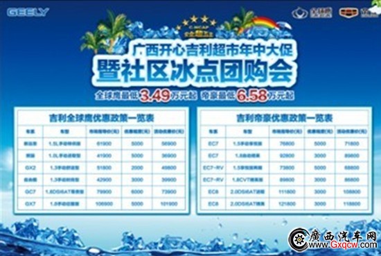 廣西開(kāi)心吉利超市年中大促暨社區(qū)冰點(diǎn)團(tuán)購(gòu)會(huì)6.23日火爆開(kāi)幕,全球鷹全系最低僅需3.49萬(wàn)元起,超五星安全GX7僅售8.98萬(wàn)元起,帝豪全系最低僅需6.59萬(wàn)元,另贈(zèng)萬(wàn)元禮包。廣西首家吉利汽車綜合旗艦店—廣西開(kāi)心吉利超市用恭迎您。