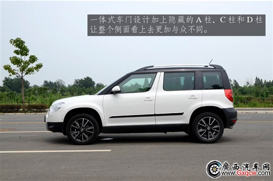 從側(cè)面很明顯地可以看出斯柯達Yeti方方正正的"盒子"造型,這種造型和秀爾有些相似,富有個性,同時黑色包圍增添了不少越野氣息。除了B柱以外A柱、C柱和D柱都采用的是隱藏式設(shè)計,突出了其與眾不同的個性。