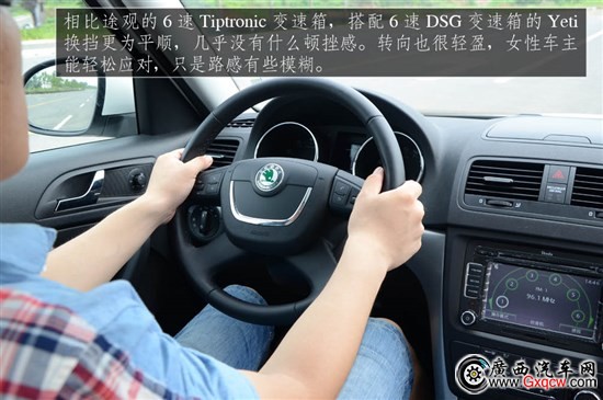 相比途觀的6速Tiptronic變速箱,搭配6速DSG變速箱的Yeti換擋更為平順,幾乎沒有什么頓挫感。轉(zhuǎn)向也很輕盈,女性車主能輕松應(yīng)對(duì),只是路感有些模糊。