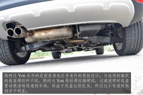 斯柯達(dá)Yeti采用的是前麥弗遜后多連桿的懸掛設(shè)計(jì)。與途觀的偏軟的懸架調(diào)校所不同,斯柯達(dá)Yeti懸掛調(diào)校偏硬朗,過減速帶時(shí)底盤震動(dòng)很清晰傳遞到車廂,而由于底盤比較扎實(shí),所以過小彎道時(shí)側(cè)傾并不明顯。