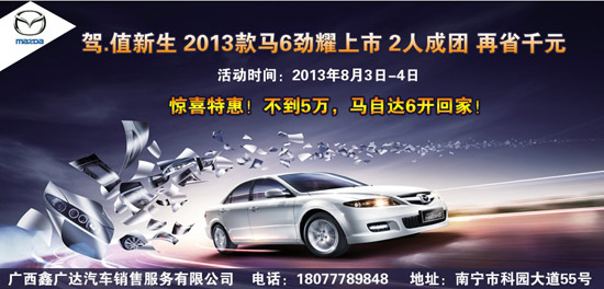 2013款馬自達(dá)6耀然新生全面上市,8月3-4日廣西鑫廣達(dá)一汽馬自達(dá)給力開團(tuán)。2人即可成團(tuán),驚喜特惠,并享超值免息貸款購車特殊金融方案,愛車貸購0距離。不到5萬,您就可以把一輛全新的超具性價比的中級轎車馬自達(dá)6開回家。夢想升級,一步到位!撥打免費400電話報名或網(wǎng)絡(luò)下訂, 再省千元。