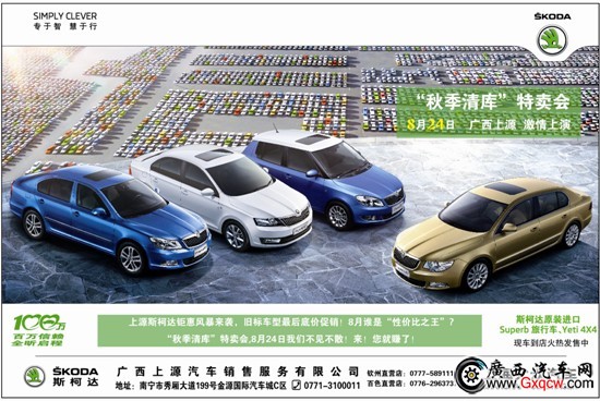 2014款斯柯達(dá)新標(biāo)車型逐步上市,斯柯達(dá)13款舊標(biāo)車型將舉辦“秋季清庫”特賣會(huì)!斯柯達(dá)舊標(biāo)車型將進(jìn)行最后底價(jià)促銷。8月誰是“性價(jià)比之王”?。盡在上源“秋季清庫”特賣會(huì)!您還在等什么!來店即享驚喜價(jià)!報(bào)名熱線:0771-3100011